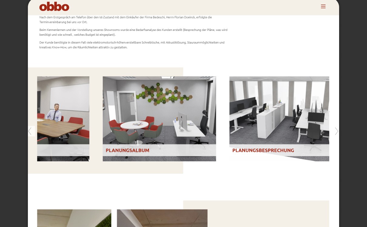 Für obbo wurden in enger Zusammenarbeit Ideen entwickelt und die inhaltlichen sowie strukturellen Anforderungen definiert. Daraus entstand ein durchdachtes Konzept als Grundlage für die weitere Umsetzung.
