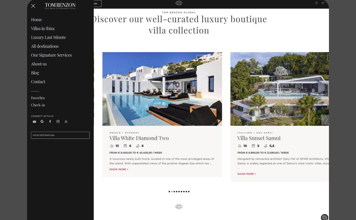 Für Tom Benzon wurde eine digitale Lösung entwickelt, die den exklusiven Anspruch der Marke widerspiegelt und die Vermittlung hochwertiger Boutique-Villen optimal unterstützt. Grundlage bildete eine durchdachte Online-Strategie, die Struktur und Nutzerführung definiert.